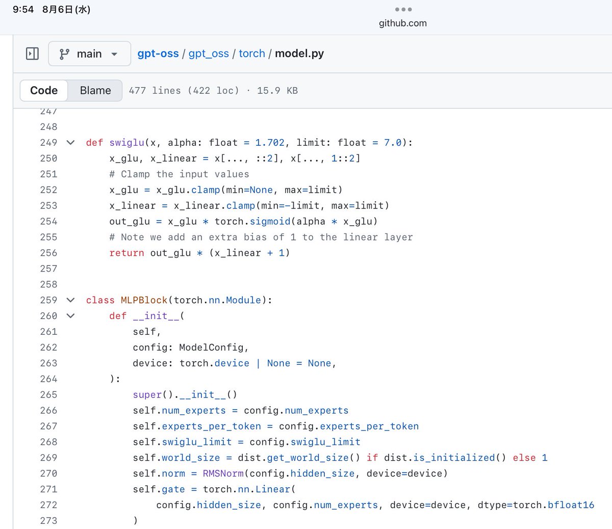 gpt-ossのPythonコードを見ていると今のChatGPTがどのように動いているかわかって楽しい😊 gpt-ossも中国系の最新モデルも、もうGELUすら使わないんだね。今はSwiGLUがスタンダードなのかな?