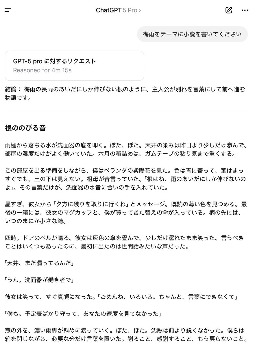 GPT-5 proに小説を書かせてみた。 o3-proの方が面白い。 を起点に、引用先の論点へ自分の評価軸を重ねた投稿です。反応が大きい投稿で、何を重要視しているかが短文でも読み取れます。