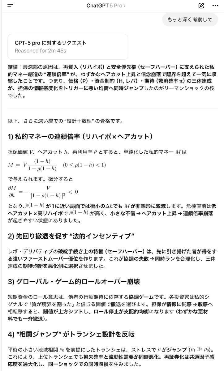 この投稿の核は、GPT-5 pro、すごく頭が良くなってる! リーマンショックの原因を4回連続で分析させたら、最終的に次のような数学を駆使した地に足のついた優れた答えが出てきた。 という一点にあります。文章量は多くありませんが、何を高く評価し、どこに差があると見ているかはかなり明確です。