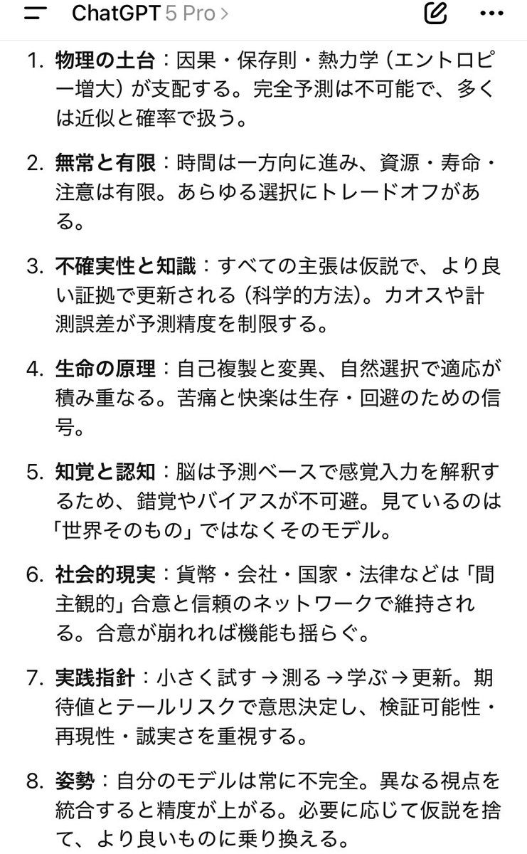 この投稿の核は、GPT-5 proの回答の続き。 高いレベルの教育を受けた人でもこの現実世界の真実を全て理解している人は少ないと思う。 という一点にあります。文章量は多くありませんが、何を高く評価し、どこに差があると見ているかはかなり明確です。