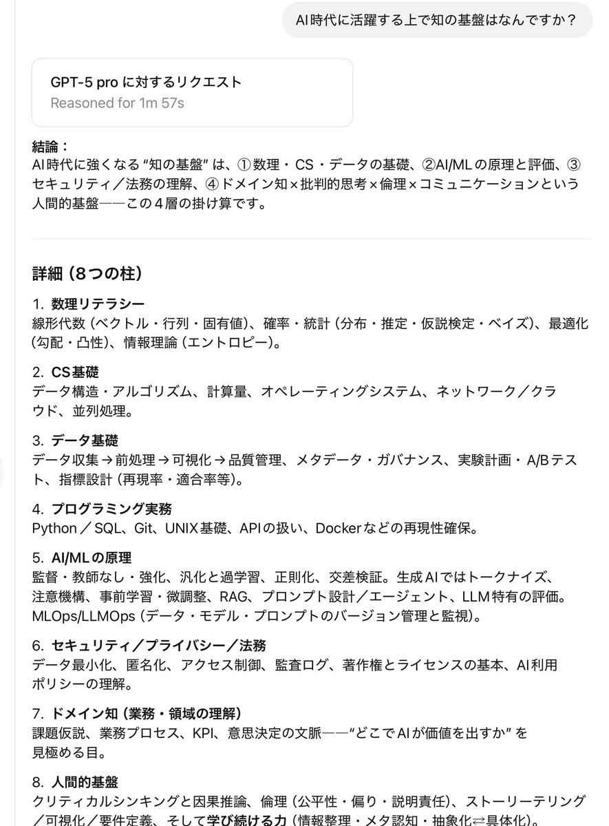 この投稿の核は、GPT-5 proが考えるAI時代に活躍する上での知の基盤。 これくらいならだいたい独学でいけますね。 という一点にあります。文章量は多くありませんが、何を高く評価し、どこに差があると見ているかはかなり明確です。