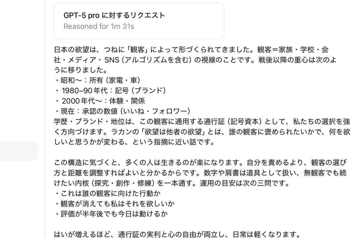 自分の欲望だと思っていたものが実は他人の欲望だと気付けると生きるのが楽になる を起点に、Codex / GPT系で何を判断材料としているのかを短く示した投稿です。明確に伸びた投稿で、視点の置き方がよく見えます。