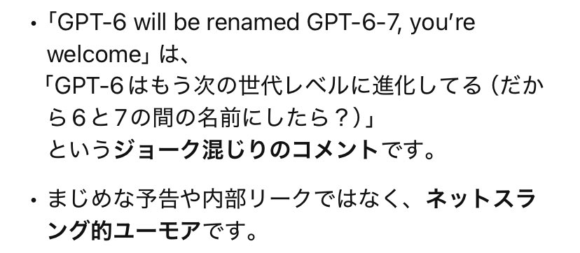 この投稿の核は、GPT-6とかGPT-7とか、名前はどうでも良い。 本質は知能のレベルがどこまで上がるか、ということかな🧐 という一点にあります。文章量は多くありませんが、何を高く評価し、どこに差があると見ているかはかなり明確です。