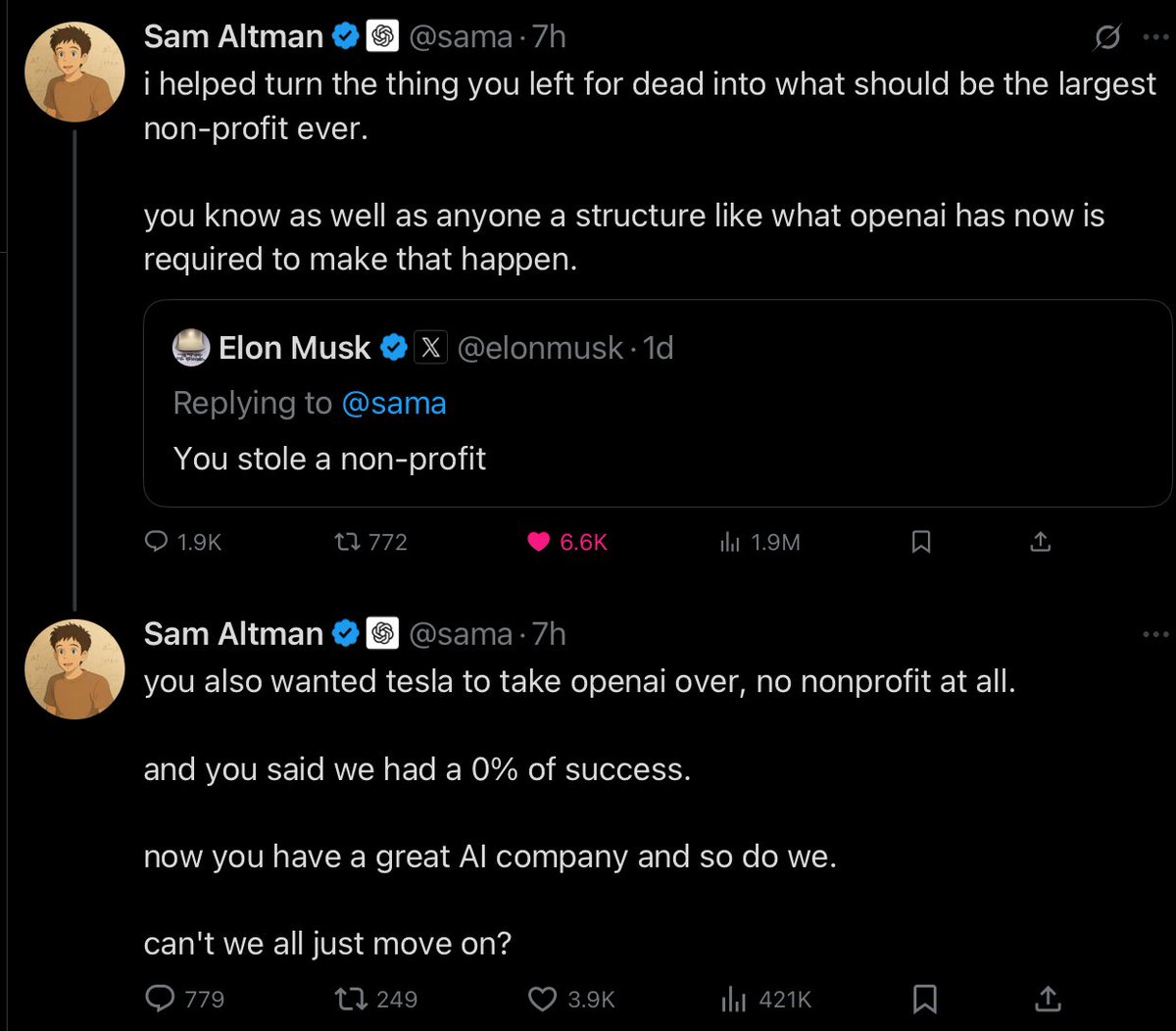 マスク氏は「You stole a non-profit(お前は非営利団体を盗んだ)」と投稿し、アルトマン氏/OpenAIの運営が創設時の非営利理念から外れ、利益優先・営利方向に変質したとして批判しました。 これに対してアルトマン氏は、「あなたが見捨てたものを私は立て直して、今は非営利であるべきものを最大にしうる組織にした」「あなたはかつてテスラにOpenAIを吸収させ、そもそも非営利として残さない方針だった」「今や双方に良いAI会社がある。もう先に進めないか?」と応じています。