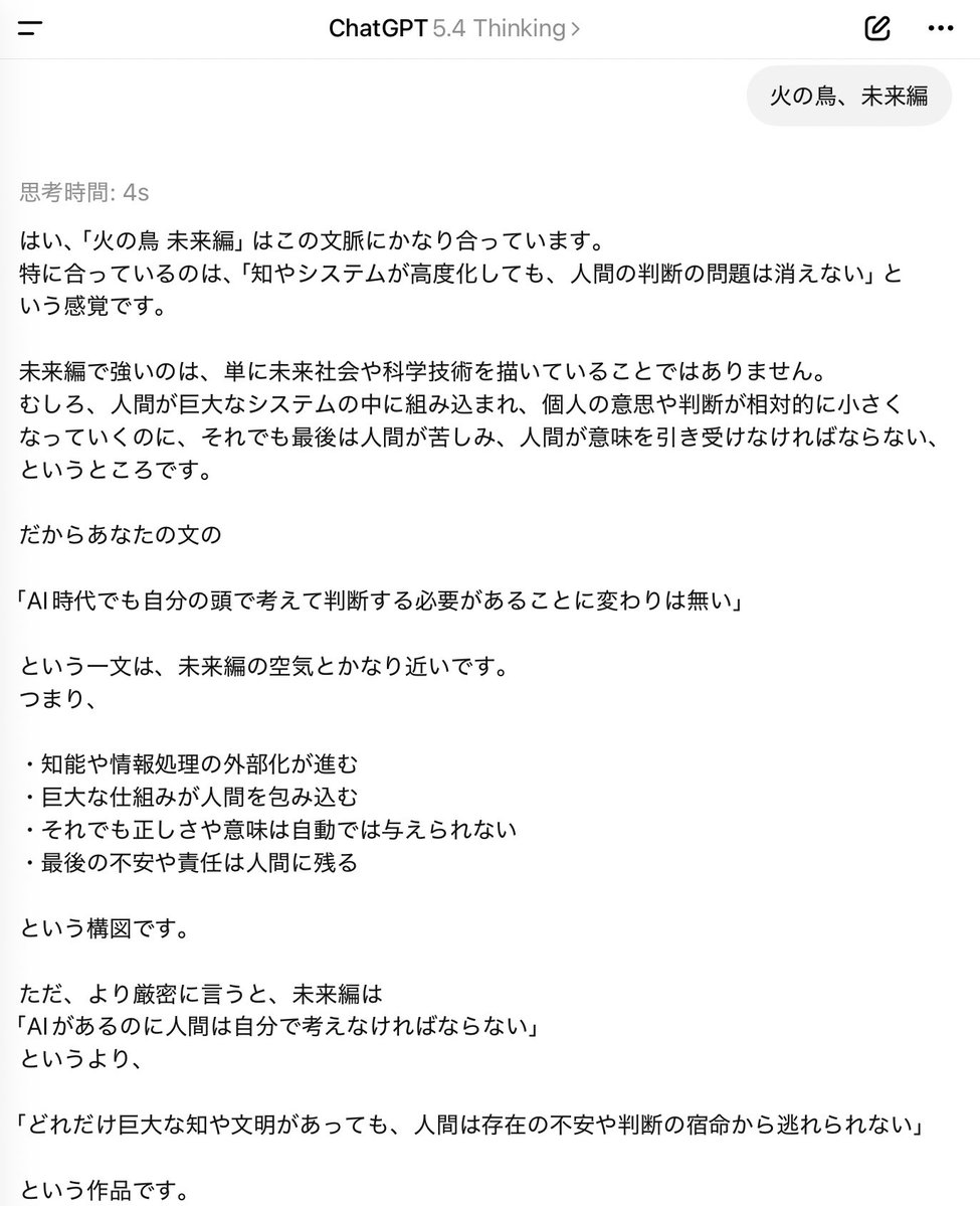 AIの投稿群の中に、作品や教養に関する短いメモが混じると、一見すると脱線に見えます。ただ実際には、何を本質と見ているか、何を抽象化して捉えているかという思考の癖が出やすい領域です。